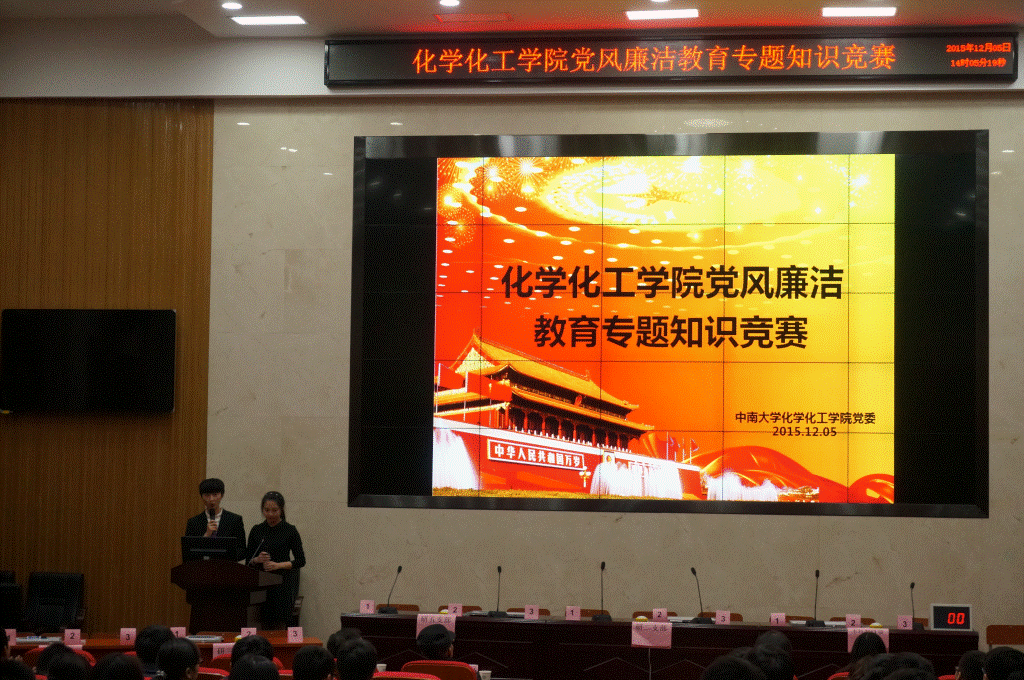 为提高学院全体党员的模范带头作用和廉洁自律意识,促进学院党风廉洁建设工作的贯彻和落实,营造“守党纪,正党风”的良好氛围,按照校党委关于“廉政建设月”的要求,化学化工学院党委组织全院25个党支部于2015年12月5日下午两点在新化学楼133报告厅举行了党风廉洁专题知识竞赛。化学化工学院党委马跃如书记、刘有才副书记以及各党支部支部书记出席了此次比赛。