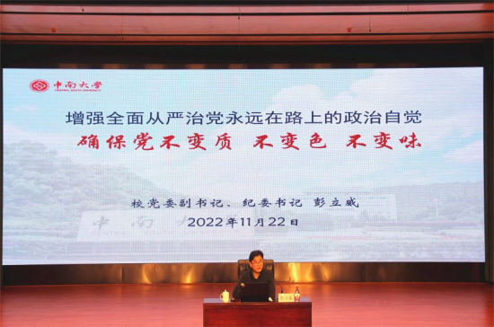 11月22日晚,彭立威在毓秀楼和声堂为冶金与环境学院教职工带去了一场以“增强全面从严治党永远在路上的政治自觉,确保党不变质、不变色、不变味”为主题的廉洁教育课。他紧密结合党的二十大报告精神,从全面从严治党十年伟大成就引入,深度剖析中管高校共性问题及学校当前存在的问题,号召广大党员干部以党的二十大精神为指引,恪守初心、做新时代忠诚担当的廉洁干部。