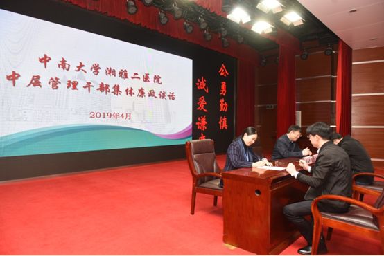 为贯彻全面从严治党和反腐败要求,营造风清气正的医院环境,进一步提高中层管理干部廉洁自律意识,不断增强拒腐防变能力,4月11日下午,湘雅二医院开展了全体中层管理干部集体廉政谈话和重点岗位人员个别廉政谈话,党委书记罗爱静、院长周智广,党委副书记、纪委书记邱元正参加。谈话由纪委副书记、监察办主任夏良伟主持。
